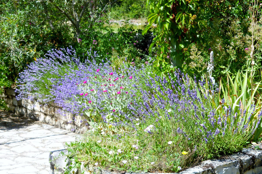 Le jardin est agrémenté en majorité de plantes méditerranéennes : lavandes, romarins, vivaces qui ont besoin de peu d’eau en été, la pelouse est de l’herbe rustique : verte au printemps, sèche l’été mais qui reverdit à la moindre pluie.